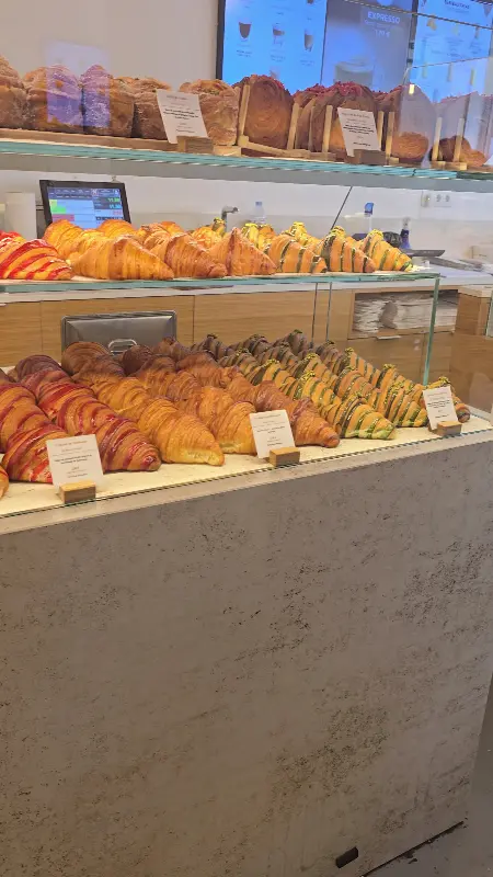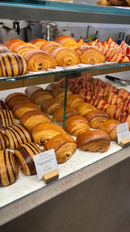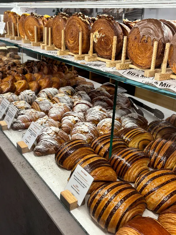 진열대 안에는 겹겹이 쌓인 페이스트리, 초콜릿 드리즐이 뿌려진 크루아상, 아몬드 슬라이스가 듬뿍 올라간 빵들이 먹음직스럽게 진열되어 있었다. 마치 보석처럼 빛나는 빵들을 보니, 하나만 고르기가 너무 어려웠다.