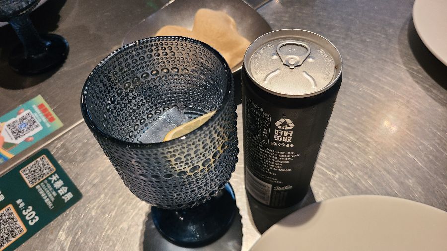 식사를 더욱 풍성하게 해줄 시원한 음료도 빼놓을 수 없었습니다. 독특한 질감의 푸른색 유리컵에 담긴 시원한 음료는 입안을 상쾌하게 해주었고, 옆에는 깔끔한 디자인의 캔 음료가 놓여 있었습니다. 테이블에 비치된 QR 코드를 통해 쉽게 멤버십 가입이나 추가 주문이 가능해, 빠르고 효율적인 시스템이 인상 깊었습니다. 전반적으로 깨끗하게 관리된 식당 내부와 친절하고 신속한 직원들의 응대는 식사 내내 기분 좋은 경험을 선사했습니다.
