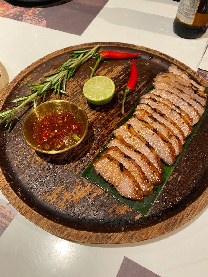 그중에서도 특히 눈길을 사로잡은 것은 큼지막한 나무 플레이트에 정갈하게 담겨 나온 돼지고기 구이였습니다. 먹음직스럽게 구워진 고기 조각들이 바나나 잎 위에 가지런히 놓여 있었고, 붉은 고추와 상큼한 라임, 향긋한 로즈마리가 멋스러운 가니시를 이루고 있었습니다. 함께 나온 매콤새콤한 디핑 소스는 고기의 풍미를 한층 더 끌어올려 주었죠. 숯불 향이 은은하게 배어 있는 듯한 고기는 겉은 바삭하고 속은 촉촉하여 씹을수록 고소한 육즙이 입안 가득 퍼졌습니다.