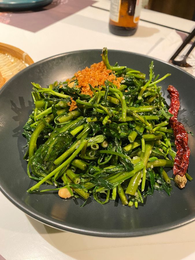 신선한 채소를 맛볼 수 있는 모닝글로리 볶음도 빼놓을 수 없었습니다. 아삭한 식감이 살아있는 푸른 채소는 마늘과 함께 볶아져 고소하면서도 알싸한 풍미를 자랑했습니다. 그 위에는 바삭한 튀긴 마늘 플레이크가 듬뿍 올라가 있어 식감과 맛을 동시에 즐길 수 있었습니다. 매콤한 붉은 고추가 주는 시각적인 자극은 미각을 더욱 생생하게 깨웠습니다.