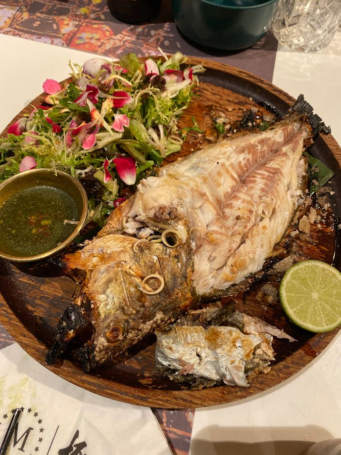 또 다른 메인 요리로는 큼직한 생선 구이가 나무 플레이트 위에 샐러드와 함께 멋지게 서빙되었습니다. 겉은 바삭하게 익고 속살은 촉촉한 생선은 신선함 그 자체였습니다. 라임 조각을 뿌려 상큼함을 더하고, 함께 제공된 초록빛 소스에 찍어 먹으니 동남아시아의 바닷바람이 느껴지는 듯했습니다. 알록달록한 꽃잎이 장식된 샐러드는 눈으로도 즐거운 미식 경험을 완성했습니다.