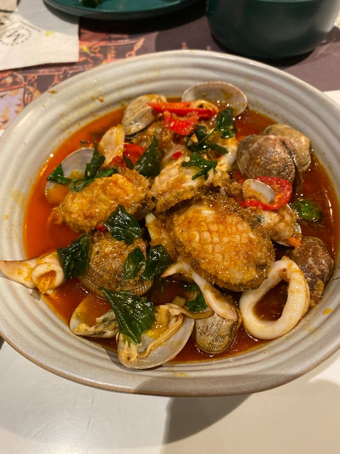 해산물을 좋아하는 이들을 위한 메뉴도 물론 있었습니다. 붉은빛 소스가 인상적인 해산물 요리에는 통통한 바지락, 쫄깃한 오징어 링, 그리고 부드러운 게살이 푸짐하게 들어 있었습니다. 매콤하면서도 깊은 감칠맛이 도는 소스는 밥과 함께 비벼 먹어도 일품이었고, 신선한 해산물과 어우러져 입안을 즐겁게 했습니다. 이처럼 Simply Thai는 재료 본연의 맛을 살리면서도 태국 특유의 풍미를 잃지 않는, 꽤 정통적인 맛을 선사합니다.