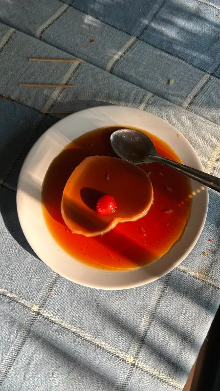 달콤한 캐러멜 시럽이 듬뿍 뿌려진 푸딩은 식사의 마지막을 장식하기에 완벽하다. 붉은 체리 한 알이 사랑스러움을 더한다.
