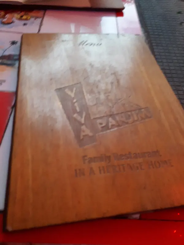 나무로 만들어진 메뉴판. Viva Panjim의 로고가 새겨져 있다.