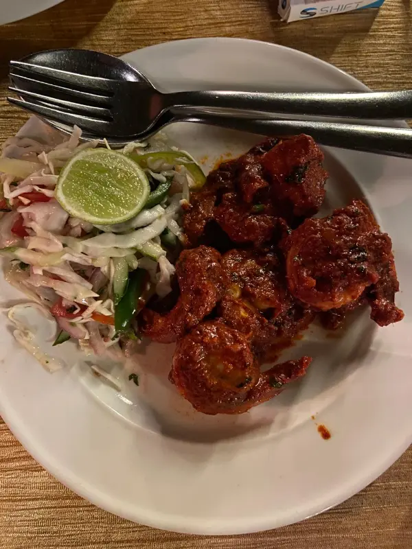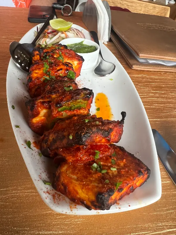 고심 끝에 카프레알 피쉬와 버터 갈릭 왕새우, 그리고 북인도 요리를 주문했습니다. 잠시 후, 테이블 위로 하나둘씩 놓이는 음식들은 보기만 해도 군침이 돌았습니다. 먼저 카프레알 피쉬를 맛보았습니다. 겉은 바삭하고 속은 촉촉한 생선 살에 매콤한 양념이 어우러져 환상적인 맛을 선사했습니다. 이어서 버터 갈릭 왕새우를 맛보았습니다. 신선한 새우의 탱글탱글한 식감과 고소한 버터, 향긋한 마늘 향이 완벽하게 조화를 이루었습니다.