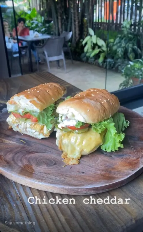테이블 위에 놓인 메뉴판에는 다양한 종류의 샌드위치, 버거, 샐러드 등이 보기 좋게 정리되어 있다.