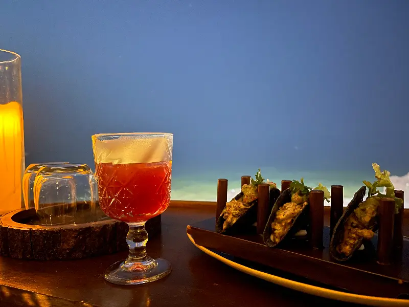 해변 바로 앞에 위치한 덕분에 탁 트인 바다 전망을 감상할 수 있었고, 활기 넘치면서도 편안한 분위기가 완벽하게 조화를 이루고 있었습니다. 은은하게 울려 퍼지는 DJ의 음악은 분위기를 더욱 고조시켜주었습니다.