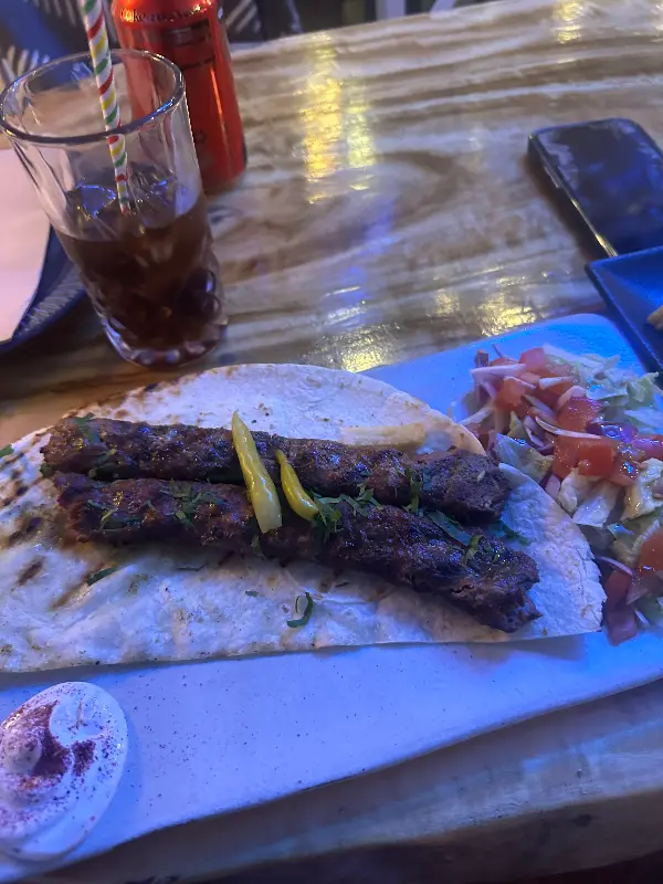 가장 먼저 나온 음식은 아다나 케밥입니다. 따뜻하게 구워진 빵 위에 얹어진 케밥은 육즙이 가득하고, 향신료의 풍미가 입안 가득 퍼집니다. 신선한 야채와 함께 곁들여 먹으니, 그 맛이 더욱 조화롭습니다.