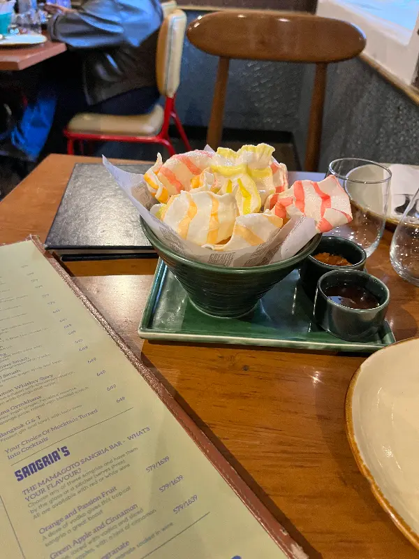 테이블 위에 놓인 형형색색의 새우 크래커는 식사 전 입맛을 돋우는 훌륭한 웰컴 스낵이었습니다.
