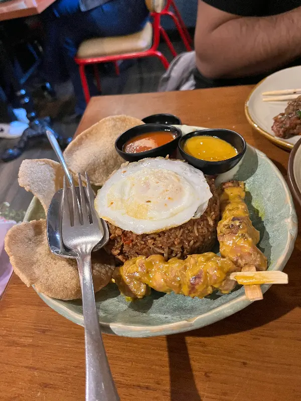 나시고렝 위에 올려진 반숙 계란은 고소한 풍미를 더해주었고, 닭꼬치는 부드러운 식감과 달콤한 양념이 조화롭게 어우러졌습니다.