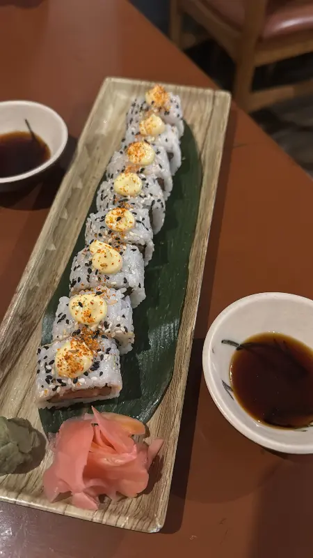 매운 연어 초밥은 신선한 연어와 매콤한 소스가 어우러져 입안을 즐겁게 자극했습니다.
