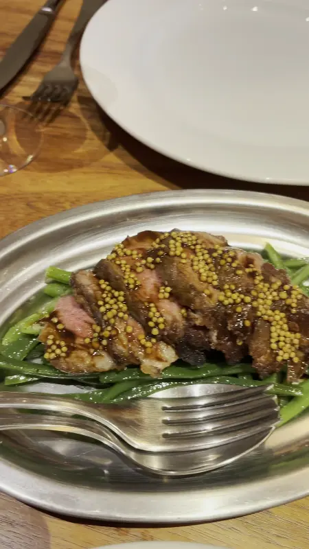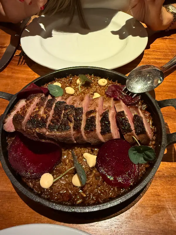 따뜻한 조명 아래 놓인 오리 가슴살 요리는 그 풍미를 더합니다. 붉은색 비트와 녹색 허브는 시각적인 즐거움까지 선사합니다.
