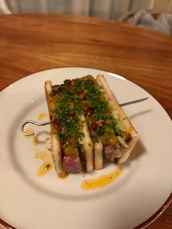 독특한 꼬챙이에 꽂혀 나오는 스테이크 샌드위치. 겉바속촉 빵과 육즙 가득한 스테이크의 조화가 환상적입니다.