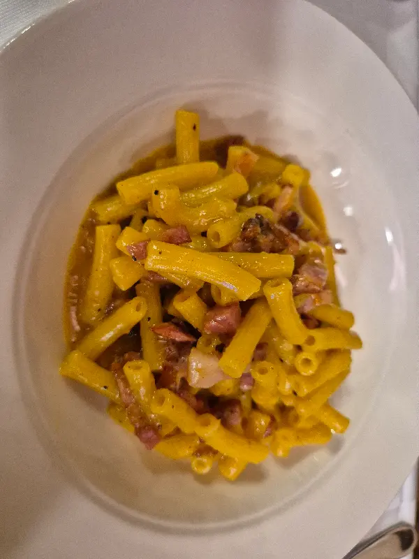 까르보나라는 한국에서 흔히 먹는 크림 파스타와는 확연히 다른 모습이었다. 노른자와 치즈, 베이컨으로만 맛을 낸 정통 까르보나라는 진하고 고소한 풍미가 일품이었다. 면발은 쫄깃했고, 짭짤한 베이컨은 감칠맛을 더했다. 다소 느끼할 수 있지만, 신선한 샐러드와 함께 먹으니 균형 잡힌 맛을 즐길 수 있었다.