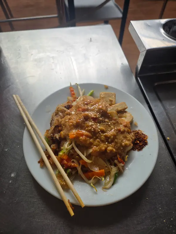 가장 먼저 맛본 것은 팟타이. 탱글탱글한 면발과 아삭아삭한 숙주, 그리고 고소한 땅콩 소스가 환상적인 조화를 이루었다. 계란 없이도 이렇게 맛있는 팟타이를 만들 수 있다니! 비건 음식에 대한 나의 편견을 완전히 깨뜨리는 맛이었다.