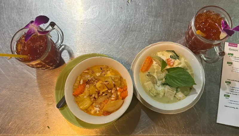 자리에 앉아 메뉴판을 펼쳐 들었다. 팟타이, 카레, 똠얌 등 다양한 태국 전통 음식들이 비건 버전으로 준비되어 있었다. 화려한 메뉴들에 눈이 휘둥그래졌다. 결정 장애가 있는 나에게는 너무나 어려운 선택의 시간이었다. 한참을 고민한 끝에, 단품 메뉴 세 개와 쌀밥, 그리고 음료 두 잔을 주문했다.