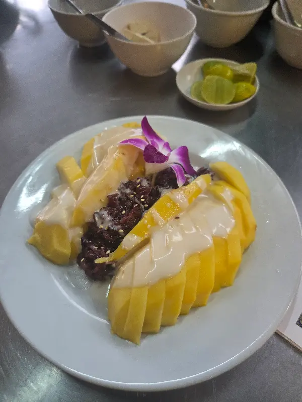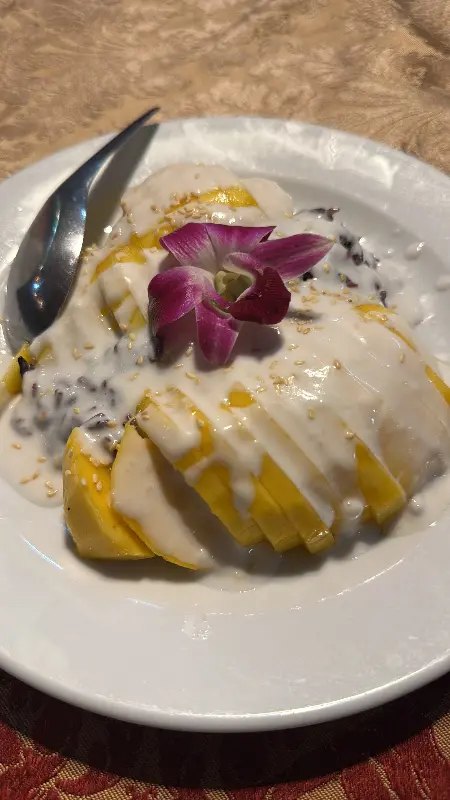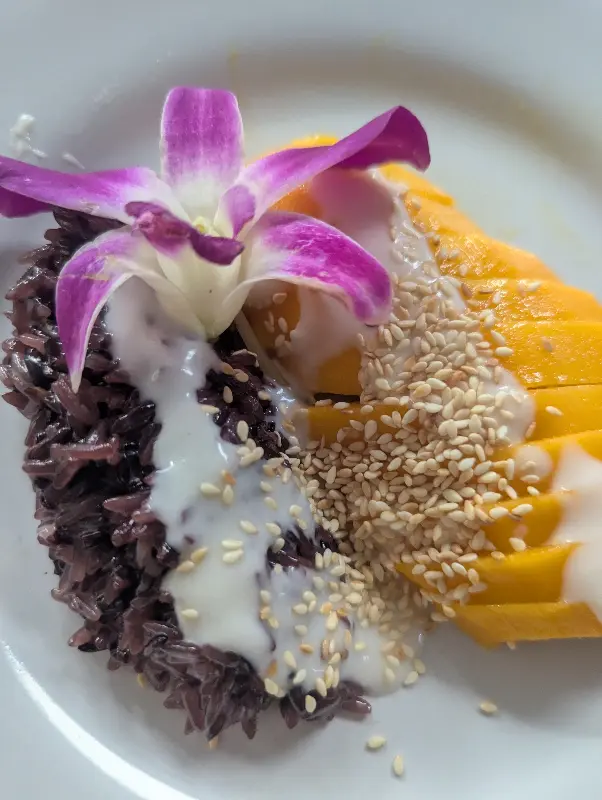마지막으로 맛본 것은 망고 스티키 라이스. 달콤한 망고와 쫀득한 찹쌀밥, 그리고 고소한 코코넛 크림의 조합은 그야말로 환상적이었다. 입안에서 사르르 녹는 듯한 부드러운 식감과 달콤한 맛은, 지친 하루를 완벽하게 마무리해주는 듯했다. 특히, 보라색 난꽃으로 장식된 플레이팅은 시각적인 즐거움까지 더해주었다. 10점 만점에 10점을 주고 싶을 정도로 완벽한 디저트였다.