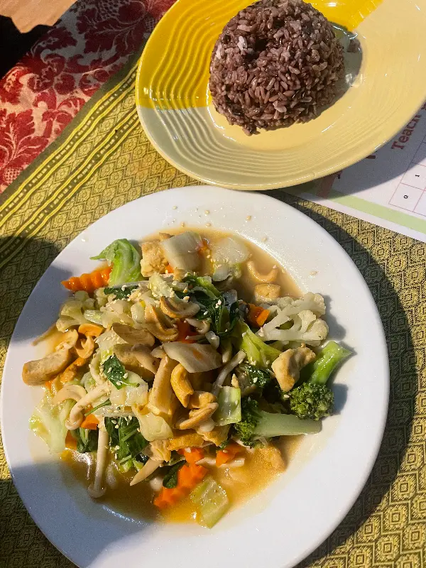 채소와 캐슈넛이 듬뿍 들어간 요리. 건강하고 맛있는 비건 음식을 즐길 수 있다.