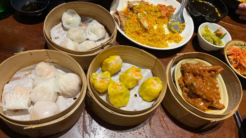 잠시 후, 주문한 음식들이 하나둘씩 테이블 위에 차려졌다. 갈비국수는 진한 갈색 국물에 푸짐한 갈비가 듬뿍 올려져 있었고, 딤섬은 김이 모락모락 나는 나무 찜기에 담겨 나왔다. 볶음밥은 윤기가 자르르 흐르는 모습이 정말 먹음직스러웠다.