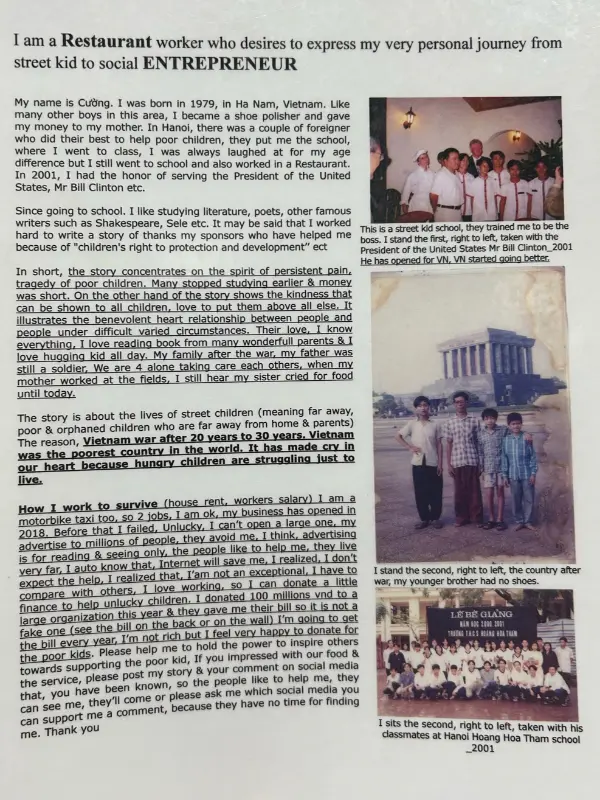 식사를 하던 중, 벽에 걸린 액자가 눈에 들어왔다. 액자 속에는 사장님의 어린 시절 사진과 함께, 그의 감동적인 이야기가 담겨 있었다. 길거리에서 어렵게 자란 소년이, 꿈을 포기하지 않고 노력하여, 지금의 식당 주인이 되었다는 이야기였다.