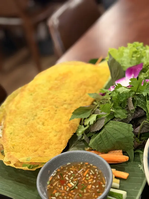 반쎄오의 압도적인 크기에 처음에는 살짝 놀랐지만, 얇고 바삭한 피 안에 가득 찬 속 재료들을 보니 군침이 절로 돌았습니다. 새우, 숙주, 돼지고기 등 다양한 재료들이 조화롭게 어우러져 풍성한 식감을 자랑했습니다. 겉은 바삭하고 속은 촉촉한 반쎄오는, 함께 제공되는 신선한 채소와 소스와 곁들여 먹으니 더욱 환상적인 맛을 선사했습니다.