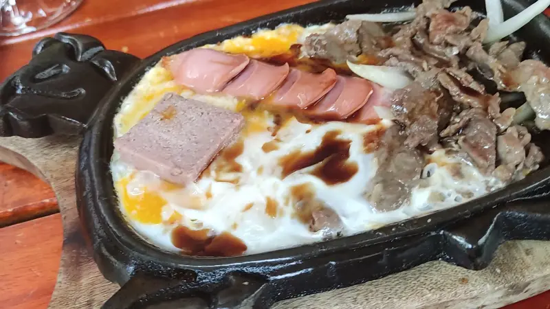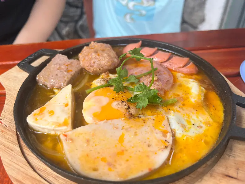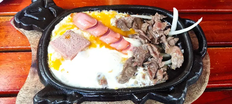주문한 음식이 나오기까지는 시간이 조금 걸렸다. 하지만 나는 전혀 초조해하지 않았다. 식당 안의 풍경을 구경하며, 사람들의 대화 소리를 듣는 것만으로도 충분히 즐거웠다. 드디어 기다리고 기다리던 군빵 요리가 나왔다. 뜨거운 철판 위에서 지글거리는 군빵은 보기만 해도 군침이 돌았다. 얇게 썰린 소고기와 소시지, 그리고 계란이 함께 어우러져 있었다.