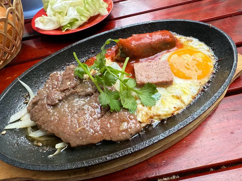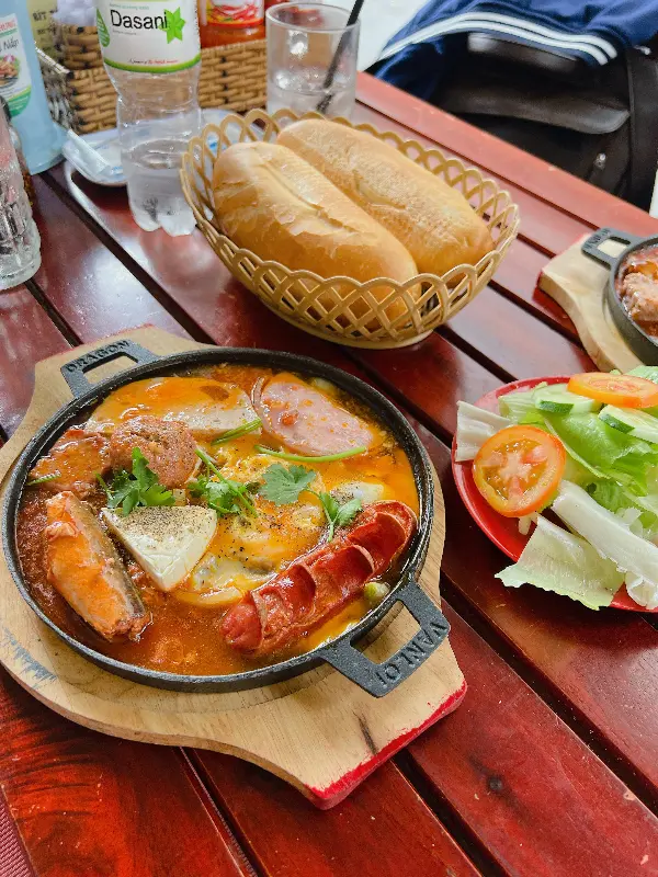나는 한쪽 구석에 자리를 잡고 앉아 메뉴판을 펼쳤다. 메뉴는 다양했다. 소고기 스튜, 빵과 함께 볶은 소고기, 군빵 등 다양한 아침 메뉴들이 준비되어 있었다. 가격은 4만~5만 VND 정도로 비교적 저렴했다. 나는 잠시 고민하다가, 가장 인기 있다는 군빵 요리를 주문했다. 그리고 금귤차도 함께 주문했다.
