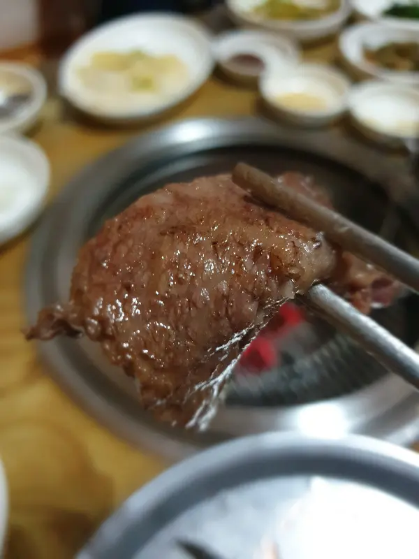 숯불 위에 갈비살을 올리자, 치익- 소리와 함께 고소한 냄새가 코를 찌른다. 젓가락을 들고 조심스럽게 뒤집으니, 노릇하게 익어가는 갈비살의 자태가 눈을 즐겁게 한다. 잘 익은 갈비살 한 점을 입에 넣는 순간, 감탄사가 절로 터져 나온다. 입안 가득 퍼지는 육즙과 숯불 향, 씹을수록 느껴지는 고소함이 환상적인 조화를 이룬다.