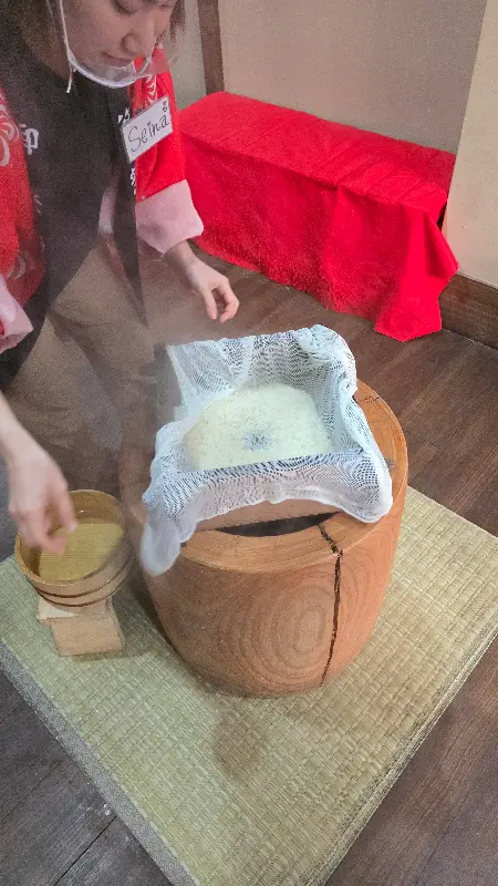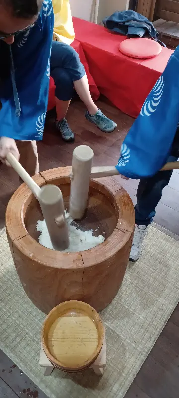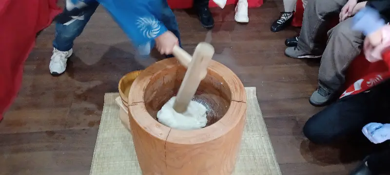 갓 쪄낸 찹쌀을 나무 절구에 넣고 찧는 과정은 정말 흥미진진했습니다. 처음에는 서툴렀지만, 스텝분들의 친절한 지도 덕분에 점점 능숙하게 떡을 찧을 수 있었습니다. 묵직한 나무 망치를 들어 찹쌀을 내리칠 때마다, 쫀득한 모찌가 만들어지는 모습이 눈앞에 펼쳐졌습니다. 함께 체험에 참여한 다른 외국인들과 웃고 이야기하며 떡을 찧는 동안, 국적과 문화를 초월한 유쾌한 분위기가 느껴졌습니다.