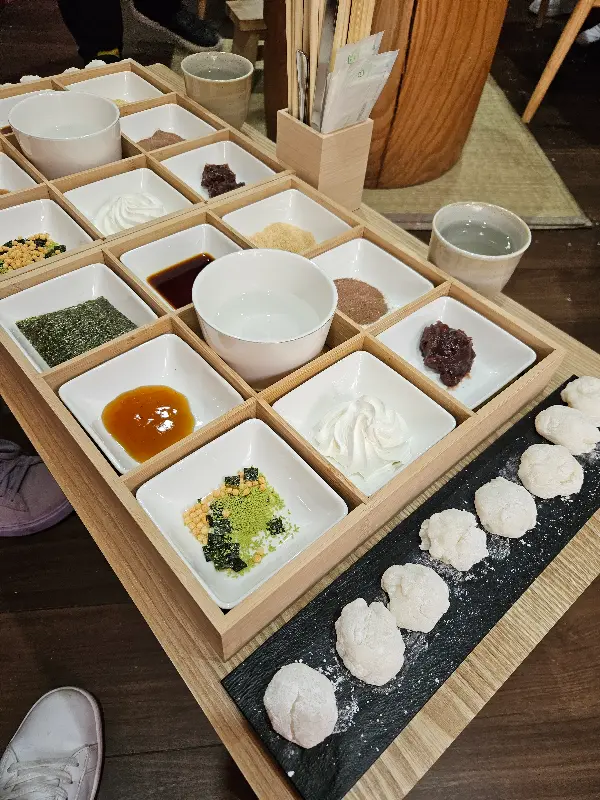 드디어 직접 만든 모찌를 맛볼 시간! 8가지 다양한 토핑이 준비되어 있었습니다. 팥, 콩가루, 김, 간장 등 익숙한 맛부터 녹차, 유자, 깨 등 독특한 풍미를 자랑하는 토핑까지, 그 종류가 정말 다양했습니다. 어떤 토핑을 선택해야 할지 고민하는 것도 즐거운 과정이었습니다.