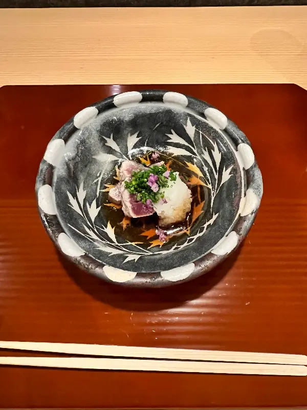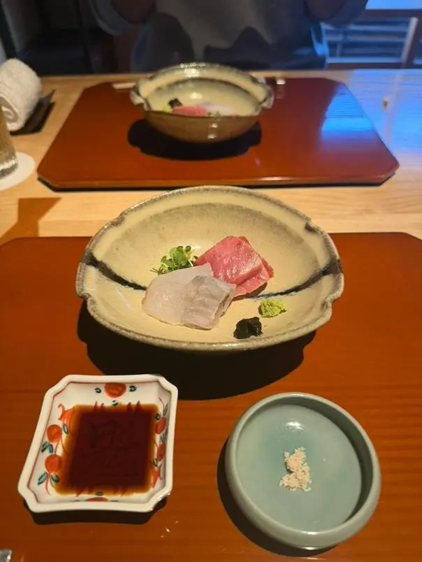 가이세키 요리는 단순한 식사가 아닌, 예술 작품을 감상하는 듯한 경험이었다. 옻칠이 은은하게 빛나는 테이블 위에 놓인, 섬세한 그림이 그려진 식기들은 그 자체로 하나의 예술 작품이었다. 계절의 색을 담은 듯한 아름다운 그릇들은 음식이 담기기 전부터 이미 시각적인 즐거움을 선사했다.