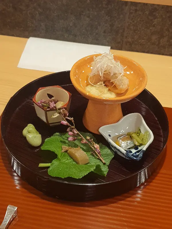 9품으로 구성된 가이세키 코스는 그야말로 미식의 향연이었다. 신선한 제철 재료를 사용하여 만든 요리들은 하나하나 정성이 가득 담겨 있었다. 특히 인상 깊었던 것은, 평소 즐겨 먹지 않던 생선 요리였다.