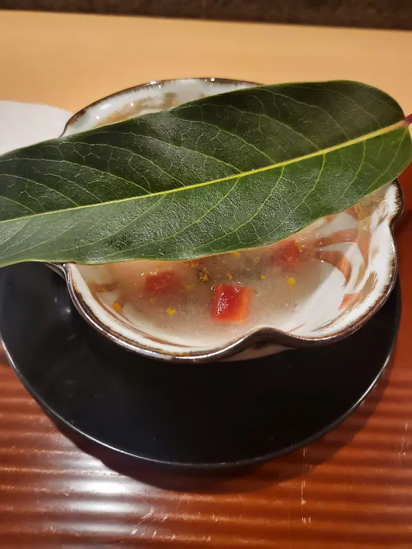 첫 번째 요리가 테이블에 놓였다. 작은 사각형 그릇 안에는 맑은 젤리처럼 보이는 투명한 액체 속에 섬세하게 손질된 재료들이 담겨 있었다. 푸른 잎사귀와 함께 놓인 모습은 마치 작은 정원을 옮겨 놓은 듯했다. 젓가락을 들기 전, 한참 동안 그 아름다움을 감상했다.