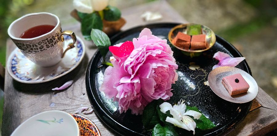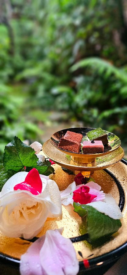 드디어 기다리던 초콜릿 세트가 테이블에 오릅니다. 쟁반 위에는 붉은 장미와 단풍잎, 싱그러운 초록 잎들이 어우러져 마치 한 송이 꽃처럼 아름답게 장식되어 있습니다. 이토록 섬세한 데코레이션은 보기만 해도 절로 미소가 지어지게 만듭니다. 초콜릿 하나하나가 작은 예술 작품 같아, 섣불리 먹기 아까울 정도입니다.