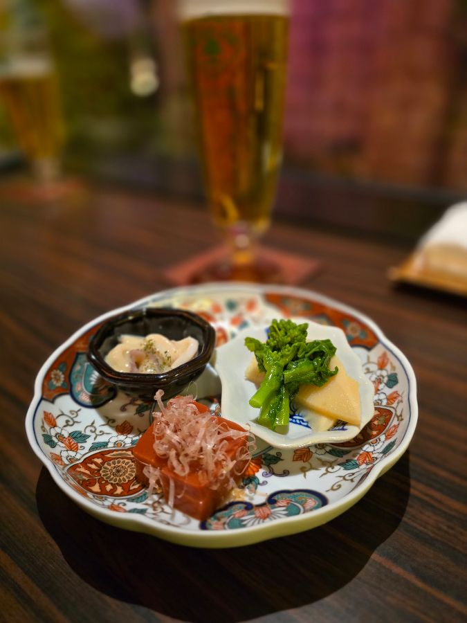 9900엔 코스 요리를 주문하면 에피타이저, 숙성회, 스테이크, 덴푸라 등 다양한 음식을 맛볼 수 있다. 가격대는 조금 있지만, 음식의 퀄리티와 양을 고려하면 충분히 만족할 만하다. 특히, 출장으로 교토를 방문한 사람들에게는 좋은 추억을 만들 수 있는 특별한 코스가 될 것이다.