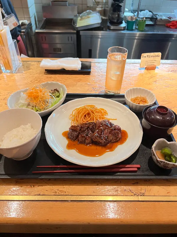 아이들과 함께 방문했는데, 교토에는 노키즈존이 종종 있는 것을 감안하면 아이들을 데리고 들어갈 수 있어서 정말 감사했습니다. 스테이크를 주문하고 기다리는 동안, 따뜻한 물수건과 함께 정갈하게 놓인 식기들이 눈에 들어왔습니다. 드디어 기다리던 스테이크가 나왔습니다. 윤기가 흐르는 붉은 빛깔의 스테이크는 보는 것만으로도 군침이 돌았습니다. 첫 입을 입에 넣는 순간, 입 안에서 살살 녹는 부드러움에 감탄사가 절로 나왔습니다. 아이들도 너무 맛있다며 정신없이 먹는 모습에 저절로 미소가 지어졌습니다.