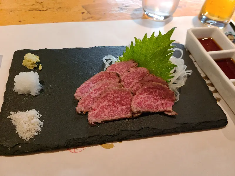 저녁 시간에는 비후카츠가 130g에 5천엔 정도로 다소 비싸게 느껴질 수 있습니다. 하지만 점심시간에는 합리적인 가격으로 훌륭한 음식을 맛볼 수 있습니다. 특히 혼자 방문하더라도 운 좋게 자리에 앉을 수 있지만, 예약이 많은 편이니 미리 예약하는 것을 추천합니다.