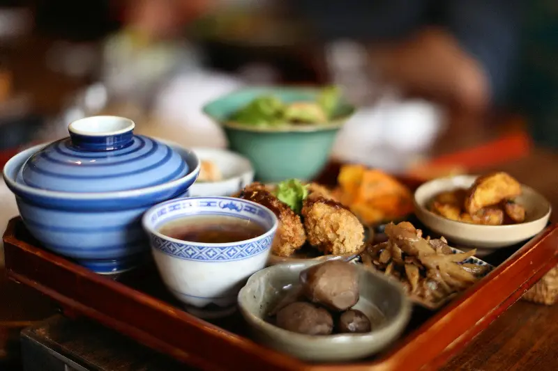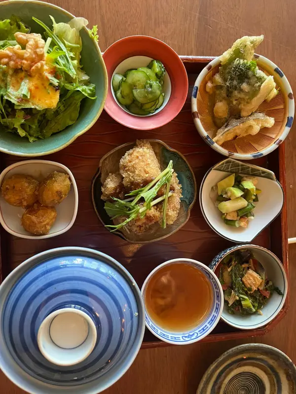 잠시 후, 정갈하게 차려진 한 상이 눈 앞에 놓였다. 알록달록한 색감의 채소들과 튀김, 그리고 밥과 국까지, 보기만 해도 건강해지는 느낌이었다. 특히 파란색 줄무늬가 돋보이는 덮밥 그릇과 찻잔은 일본 특유의 섬세한 감성을 느끼게 해주었다.