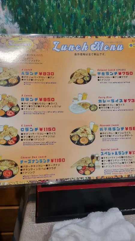 문을 열고 들어서자 아늑한 공간이 눈에 들어왔다. 4인 테이블이 8개 정도 놓인 작은 가게였지만, 따뜻한 분위기가 발길을 붙잡았다. 벽에는 아기자기한 인도풍 소품들이 장식되어 있었고, 은은한 카레 향이 코를 간지럽혔다. 주문을 위해 메뉴판을 펼쳐 들었다. 런치 메뉴는 가격도 저렴했다. A런치, B런치, 카레라이스 등 다양한 메뉴가 있었지만, 나의 눈길을 사로잡은 것은 단연 ‘난’이었다. 리뷰에서 봤던 코스트코 피자 크기라는 난의 실물을 영접하고 싶어 치즈 난 런치 세트를 주문했다.
