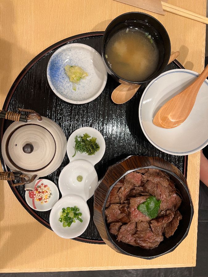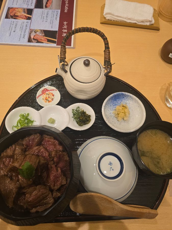드디어 주문한 A5 와규 시로인 히츠마부시가 눈앞에 모습을 드러냅니다. 뚜껑을 열자마자 고소한 와규의 향기가 코끝을 스치고, 붉은빛이 감도는 먹음직스러운 와규가 밥 위에 빼곡하게 올려져 있는 자태는 감탄을 자아냅니다. 가지런히 놓인 곁들임 찬들과 미소 장국, 그리고 따뜻한 차 주전자까지, 모든 것이 완벽한 한 상 차림을 이루고 있습니다.