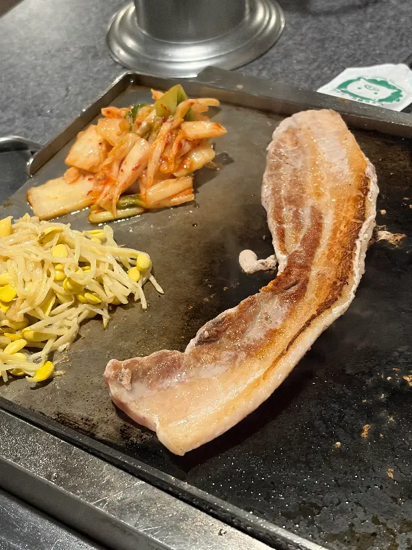 문을 열자마자 코를 찌르는 향긋한 참기름 냄새와 지글거리는 삼겹살 굽는 소리. 마치 한국의 어느 고깃집에 순간 이동이라도 한 듯한 착각을 불러일으킨다. 낯선 타지에서 느껴보는 익숙함은, 여행의 피로를 단숨에 잊게 해주는 마법과도 같다. 월요일 저녁 7시, 가게 안은 이미 많은 사람들로 북적이고 있었다. 다행히 웨이팅 없이 바로 자리에 앉을 수 있었다.
