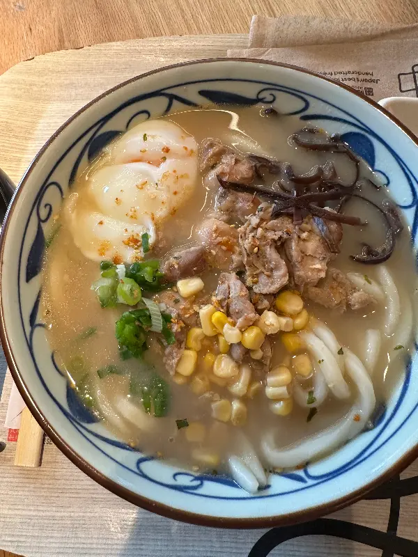 마루가메 우동은 마치 뷔페처럼 원하는 메뉴를 직접 선택하고, 추가 메뉴를 담아 마지막에 계산하는 시스템입니다. 다양한 종류의 우동과 튀김, 주먹밥 등이 보기 좋게 진열되어 있어, 마치 보물찾기를 하듯 즐거운 고민에 빠지게 됩니다. 사진 속 우동은 뽀얀 면발 위로 파와 튀김 가루가 듬뿍 올려져 있어 보기만 해도 군침이 돕니다.