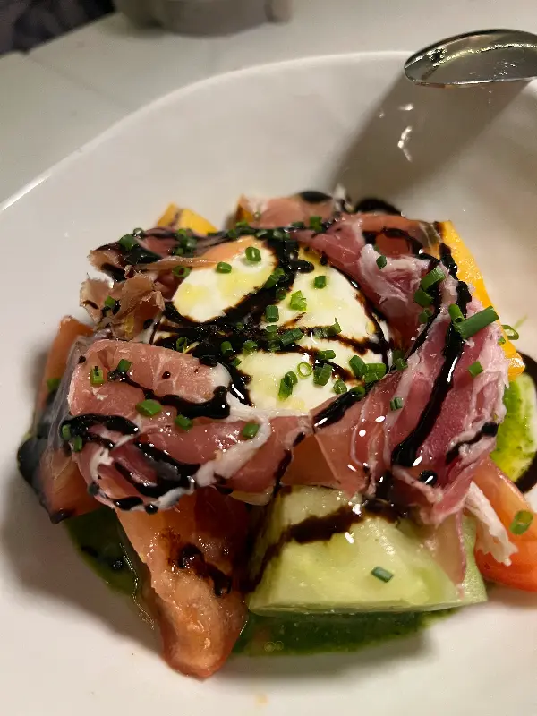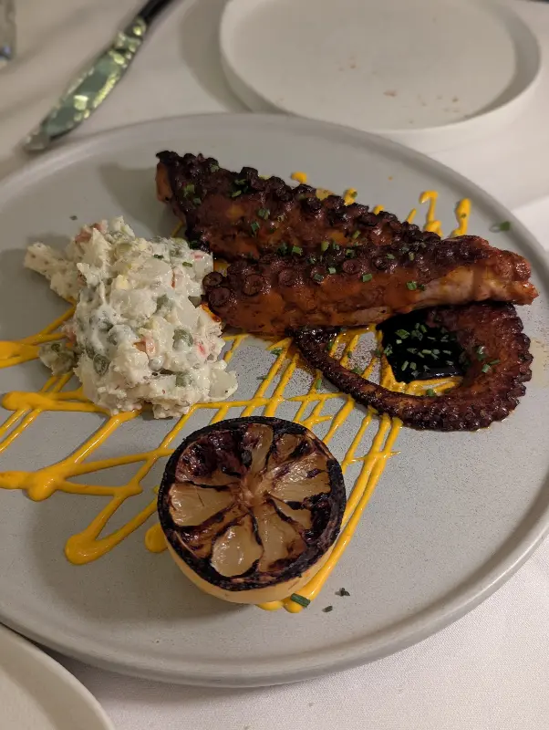 또 다른 별미였던 구운 문어는 벨벳처럼 부드러운 식감이 인상적이었습니다. 겉은 살짝 그을려져 바삭하고, 속은 촉촉하게 유지된 문어는 씹을수록 고소한 맛이 우러나왔습니다. 함께 제공된 소스는 문어의 풍미를 더욱 깊게 만들어주며, 입안 가득 행복감을 선사했습니다.