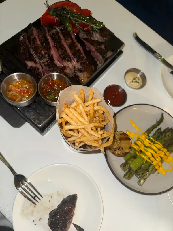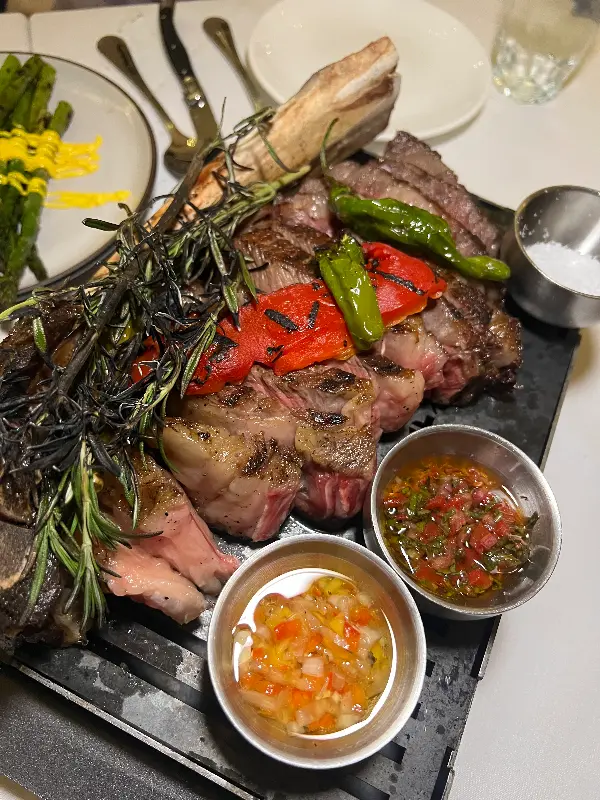 토마호크 스테이크는 립아이 스테이크와 마찬가지로 완벽한 굽기로 구워져 나왔습니다. 뼈에 붙어 있는 살은 더욱 쫄깃하고 고소했으며, 씹는 즐거움을 더했습니다. 함께 제공된 소스들은 스테이크의 다양한 풍미를 즐길 수 있도록 도와주었습니다.