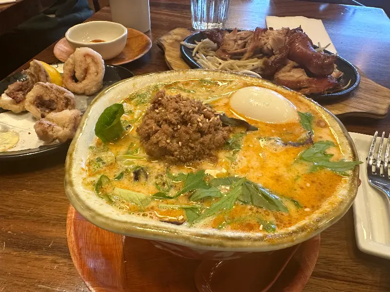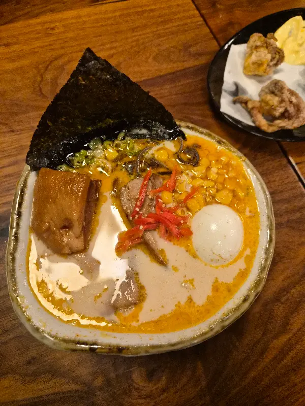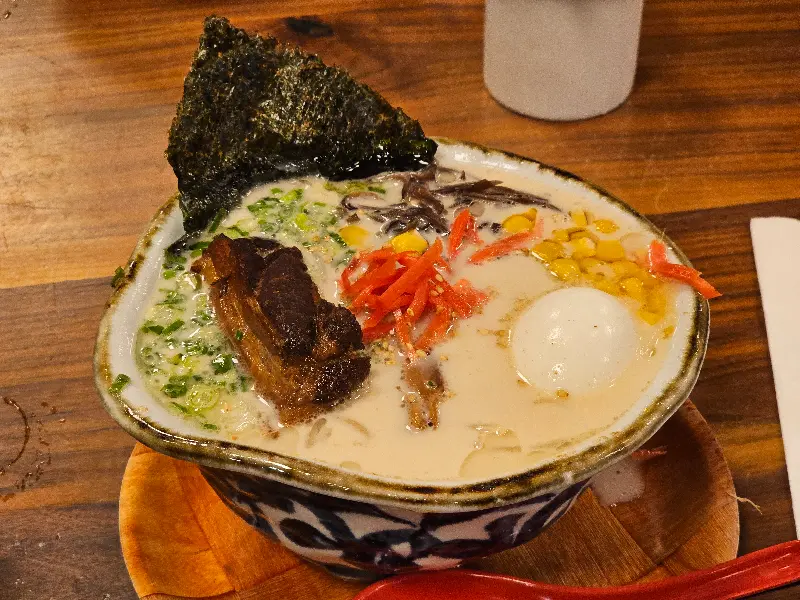 드디어 차례가 되어 따뜻한 나무 테이블에 앉았습니다. 메뉴판을 펼쳐 들고 고민 끝에 선택한 메뉴는 ‘하카타 돈코츠 DX 라멘’. 20달러라는 가격이 다소 부담스럽게 느껴질 수도 있지만, 비주얼을 보는 순간 그런 생각은 사라집니다. 뽀얀 국물 위에 얇게 저민 차슈 세 점과 큼지막한 고기 덩어리, 그리고 반숙 계란이 얹어져 있습니다. 김과 옥수수 등 푸짐한 토핑은 식감을 더욱 풍성하게 해줍니다.