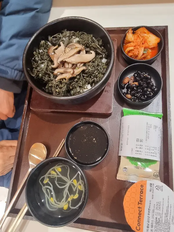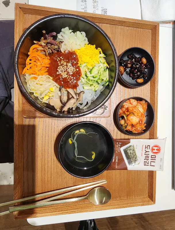 백년옥에서는 순두부찌개뿐만 아니라 다양한 한식 메뉴를 맛볼 수 있습니다. 사진 속 비빔밥은 갖가지 신선한 채소와 고소한 참기름 향이 어우러져 입맛을 돋우는 메뉴입니다. 함께 제공되는 콩나물국, 김치, 콩자반은 비빔밥의 맛을 더욱 풍성하게 만들어줍니다. 나무 쟁반에 담겨 나오는 정갈한 모습은 마치 고급 한정식집에 온 듯한 느낌을 선사합니다.