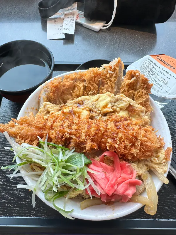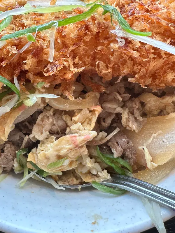 사진을 보면 튀김옷이 바삭하게 튀겨진 돈카츠와 달콤 짭짤한 소스가 곁들여진 규동이 밥 위에 푸짐하게 올려져 있는 것을 확인할 수 있습니다. 파와 양파도 함께 곁들여져 있어 느끼함을 잡아줍니다. 든든한 한 끼 식사로 손색없는 메뉴입니다.