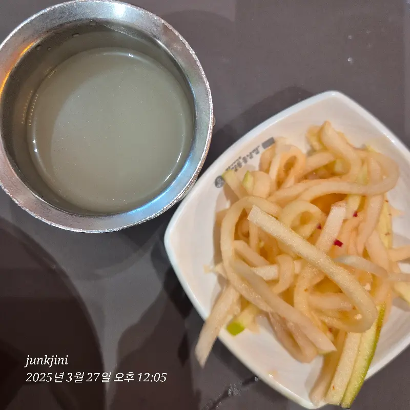 사진 속 냉면과 함께 제공되는 무절임은 아삭한 식감과 새콤한 맛으로 입안을 개운하게 해줍니다. 시원한 물 한 잔은 매콤한 음식을 먹은 후 입 안을 깔끔하게 정리해주는 역할을 합니다.