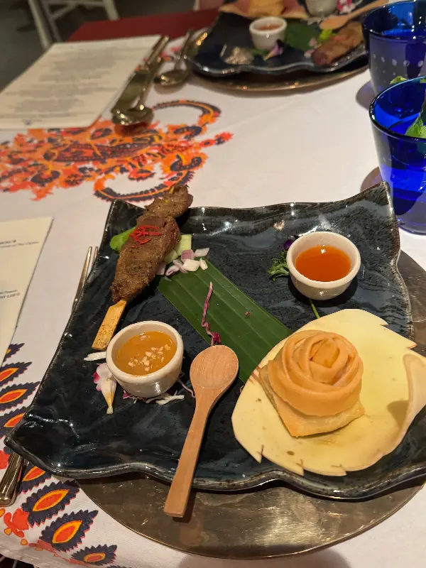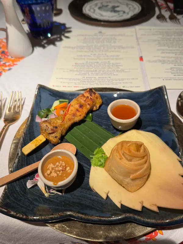 가장 먼저 등장한 것은 보기만 해도 눈이 즐거운 사테였습니다. 윤기가 흐르는 꼬치구이는 입안에서 살살 녹았고, 곁들여진 소스는 풍미를 한층 더 끌어올렸습니다. 접시 위에 놓인 작은 꽃 장식은 음식의 아름다움을 더했습니다.