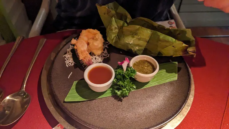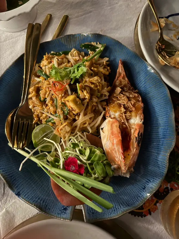팟타이는 말할 것도 없이 훌륭했습니다. 탱글탱글한 면발과 새우의 조화는 환상적이었고, 땅콩 가루와 라임즙이 더해져 고소하면서도 상큼한 맛을 선사했습니다. 곁들여진 꽃 장식은 팟타이를 더욱 특별하게 만들어주었습니다.